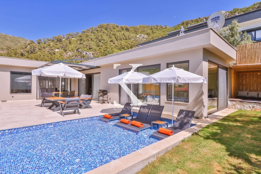 A conservative honeymoon villa located in the peaceful Islamlar village of Kalkan, offering a getaway in nature. This 2-bedroom villa is ideal for honeymoon couples and small families with its accommodation capacity of 4 people. The modern and unique design of the villa has made it a popular holiday option by offering luxury and comfort together.