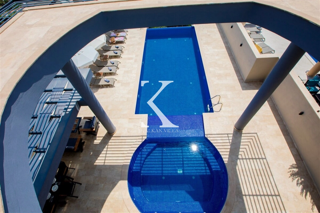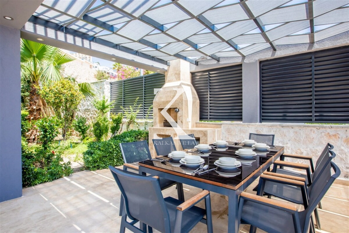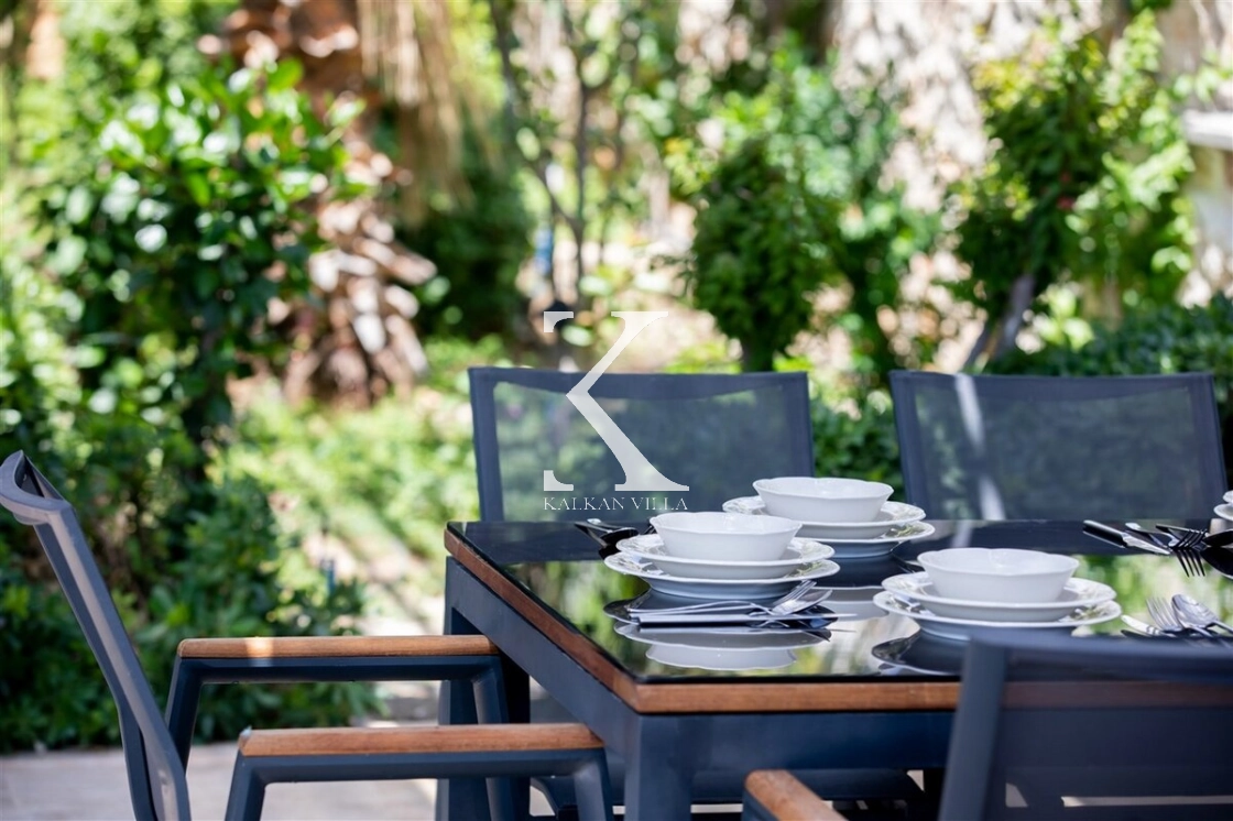 The villa features a spacious private garden with a private swimming pool, sun loungers, outdoor seating area, barbecue, and a dining table where you can enjoy meals while admiring the stunning scenery.