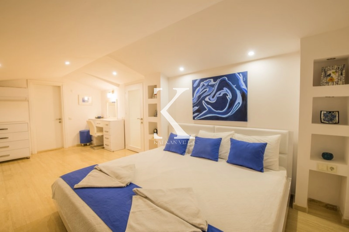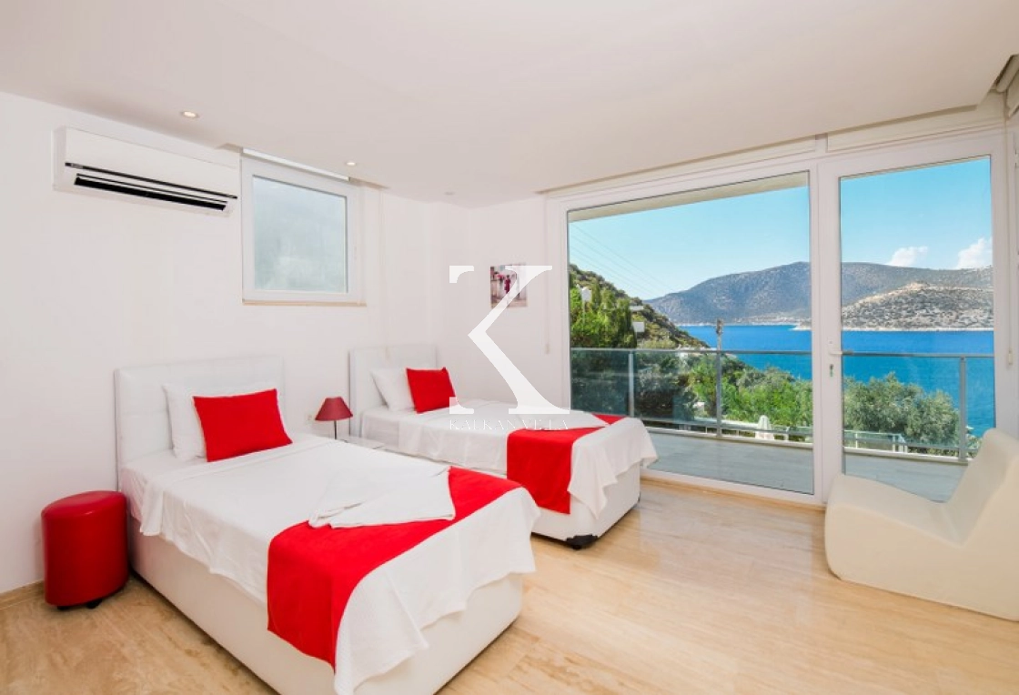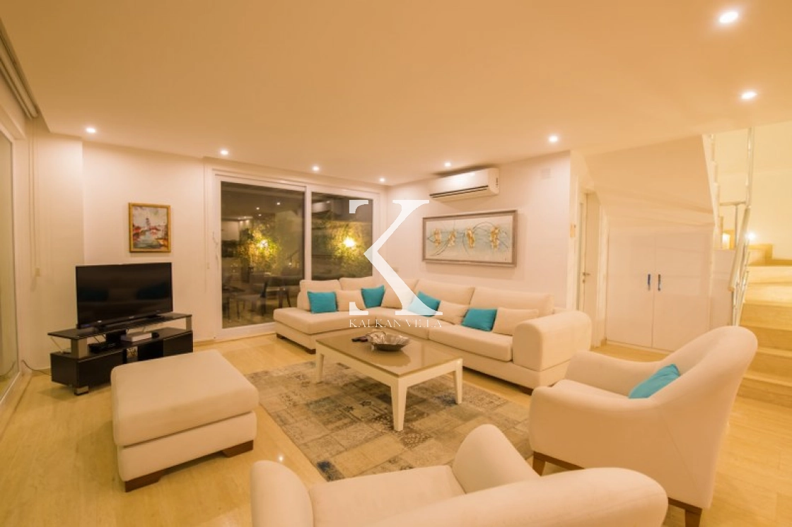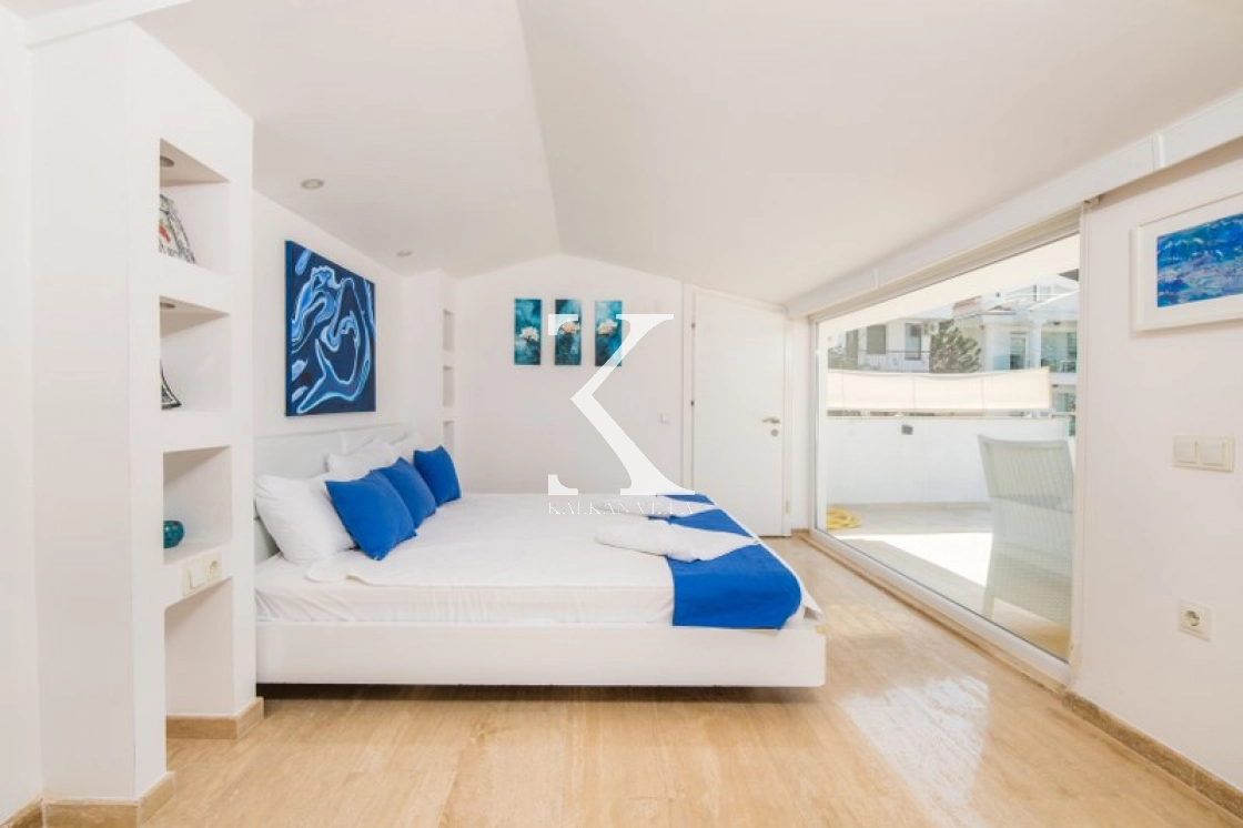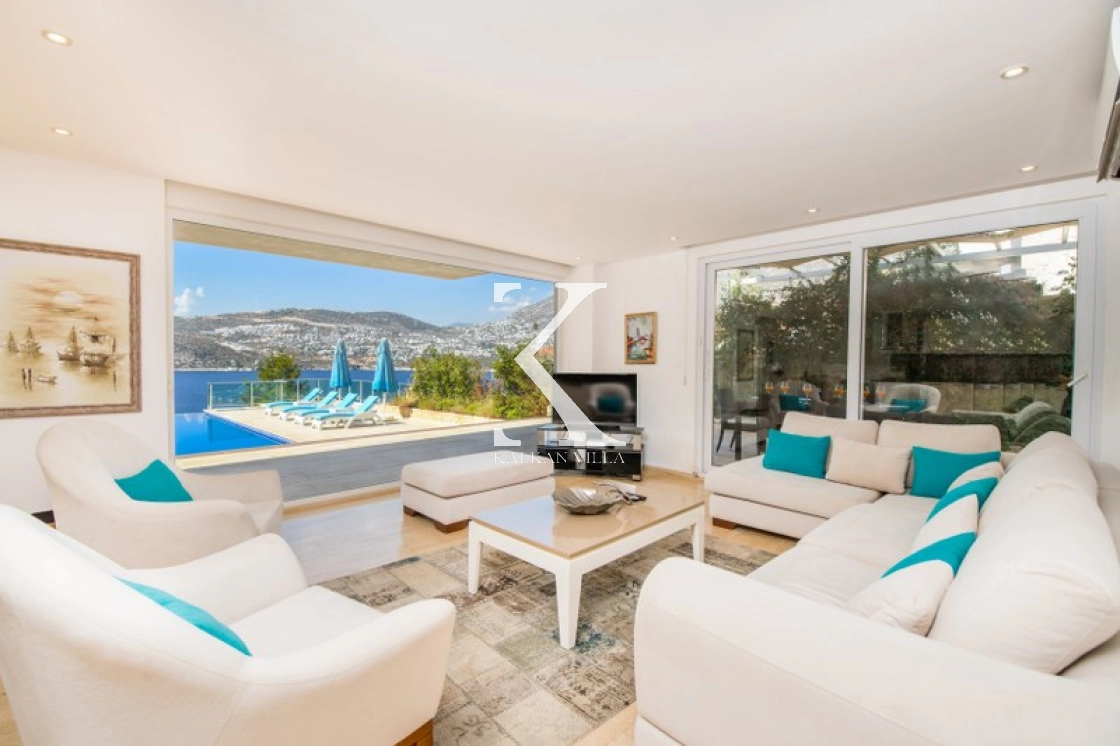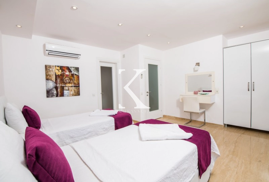 Located in Kışla, one of Kalkan’s most exclusive areas, just 500 meters from the sea, this modern 3-bedroom villa sleeps up to 6 people. Enjoy moments of relaxation overlooking the Mediterranean Sea on its infinity pool and large terrace with sun loungers, a seating area, a BBQ, and a dining table.