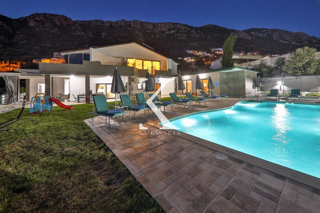 Luxury villa with 6 bedrooms, panoramic views, tennis court, Turkish bath and sauna, and a play/entertainment area.
