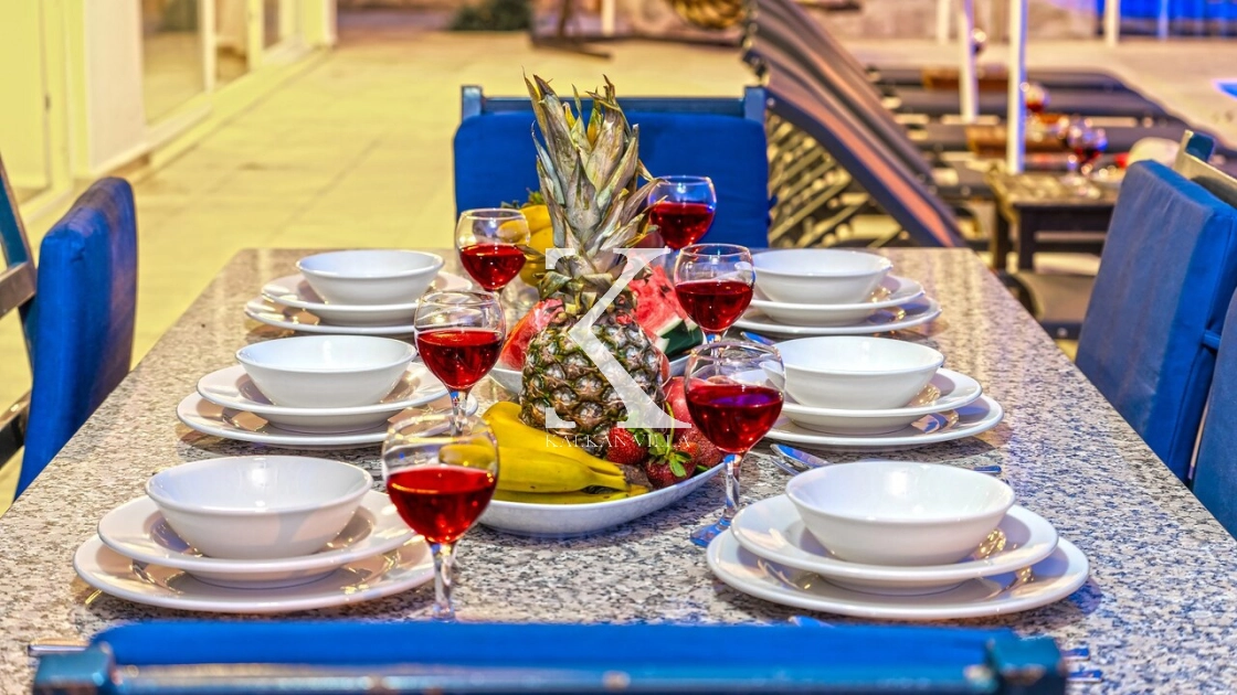 Upon entering the villa, you are welcomed by a bright and spacious living room, furnished with a modern seating group, large-screen TV, and air conditioning. This inviting space is perfect for relaxing after a day in the sun. The open-plan American kitchen is fully equipped with all necessary appliances, making it ideal for both short and long stays.