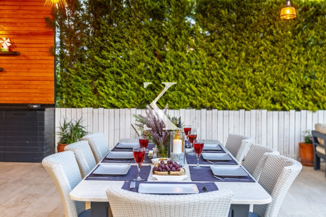 The villa offers a panoramic garden with a private infinity pool, sun loungers, umbrellas, an open kitchen, a pergola, table tennis, a barbecue area, and a dining table where you can enjoy dinner with a view of the sunset.