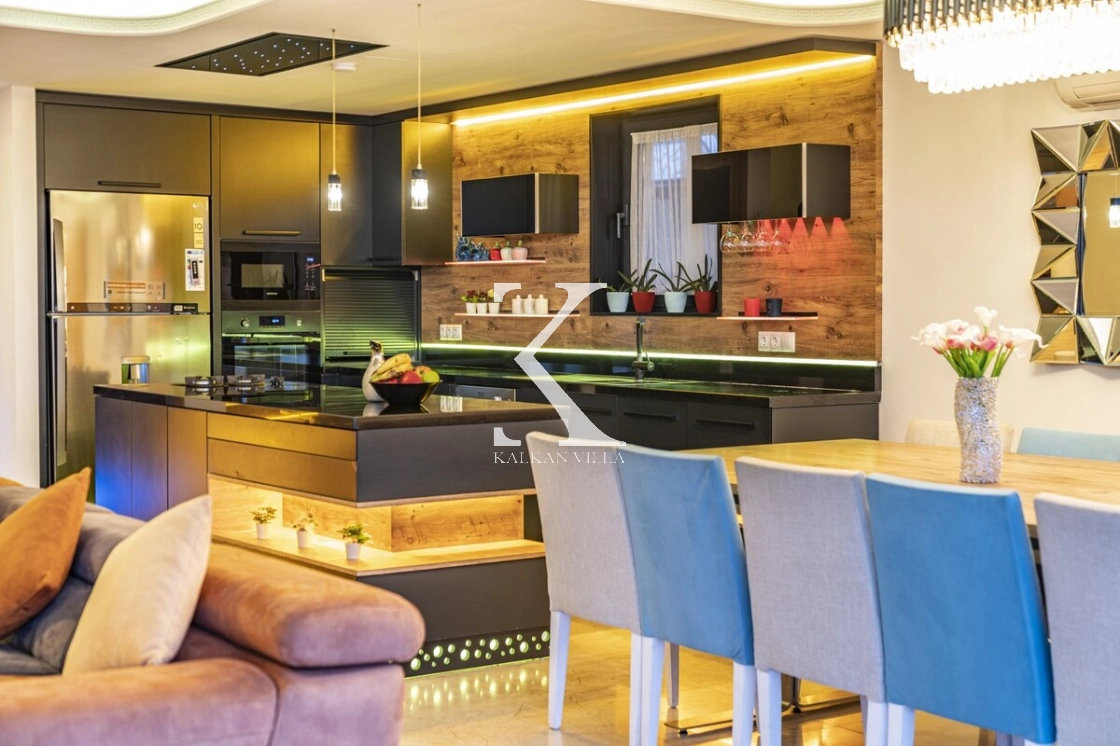 The fully equipped, stylish American-style kitchen includes a refrigerator, dishwasher, washing machine, oven, built-in hob, microwave, electric kettle, cookware, and a 12-person dining set — everything you need for a comfortable stay.