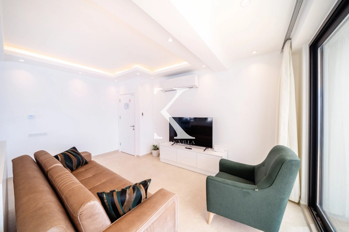 The living room boasts stunning sea views and is furnished with a luxurious and comfortable seating area, TV, and air conditioning. Direct access to the pool terrace is available from the living area.