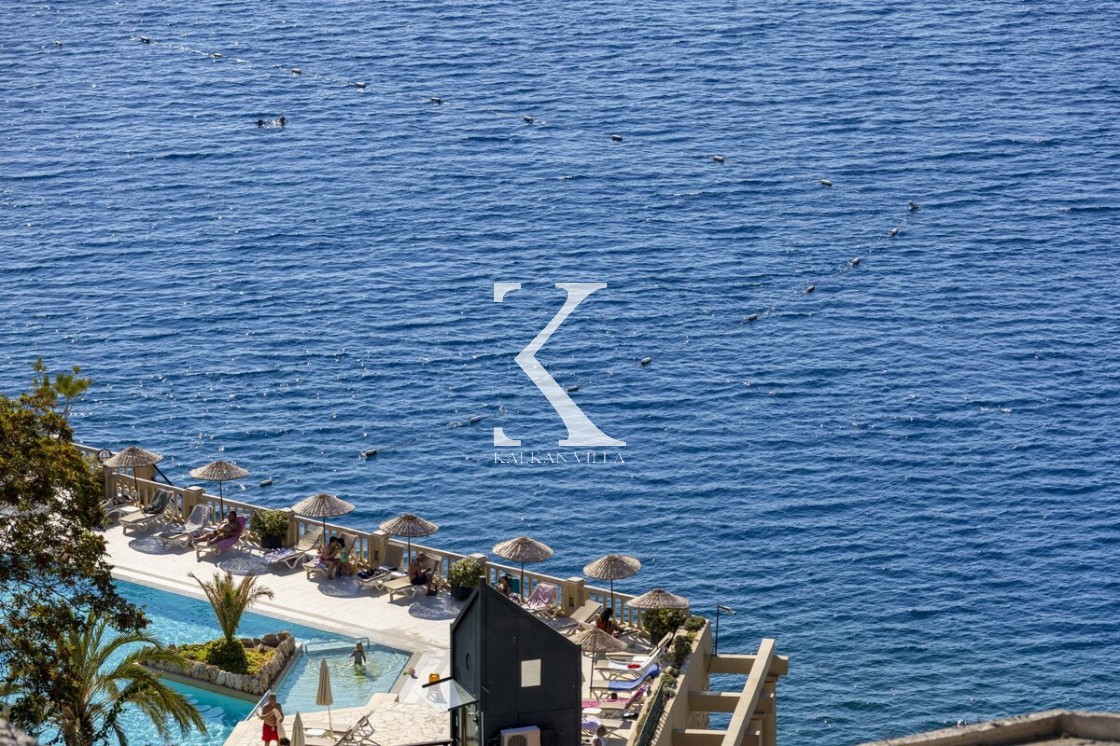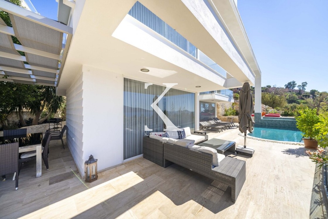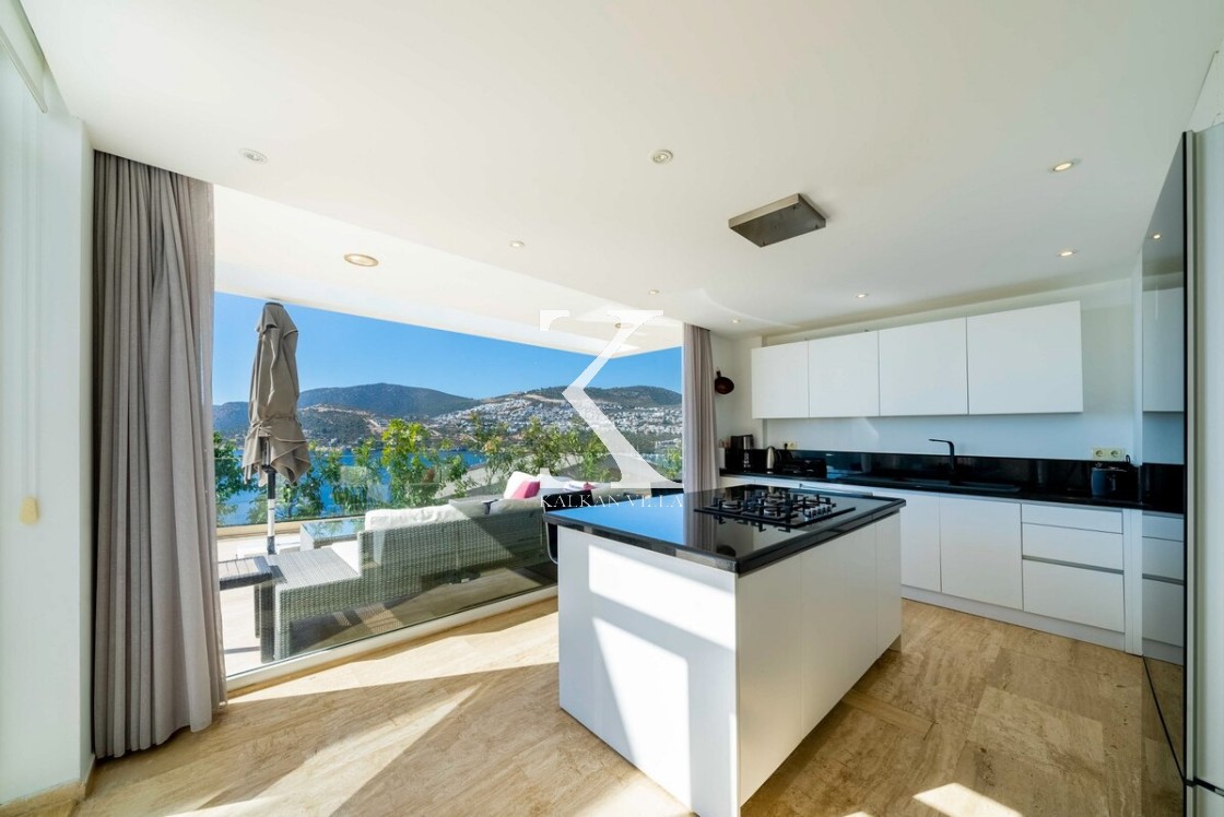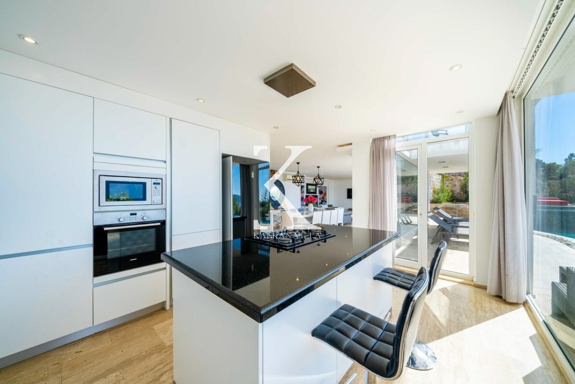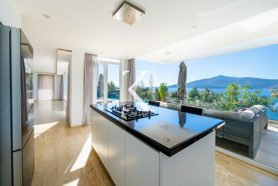 Modern kitchen, spacious lounge, and panoramic sea-view terrace