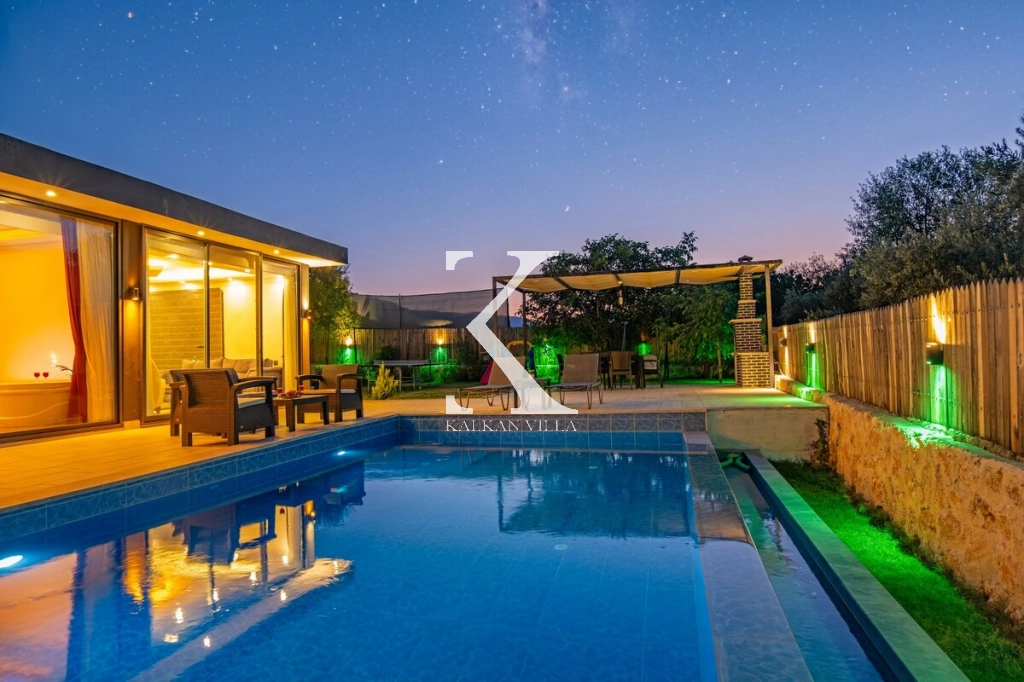 Villa Hisar is a special villa in the Sarıbelen Region of Kalkan, offering a peaceful and comfortable holiday opportunity surrounded by nature. The villa, which has 2 bedrooms and a capacity of 4 people, offers a perfect option especially for honeymoon couples and conservative families. With its sheltered pool, large garden and modern living spaces, it promises its guests a comfortable and enjoyable holiday.