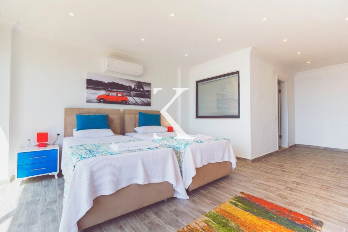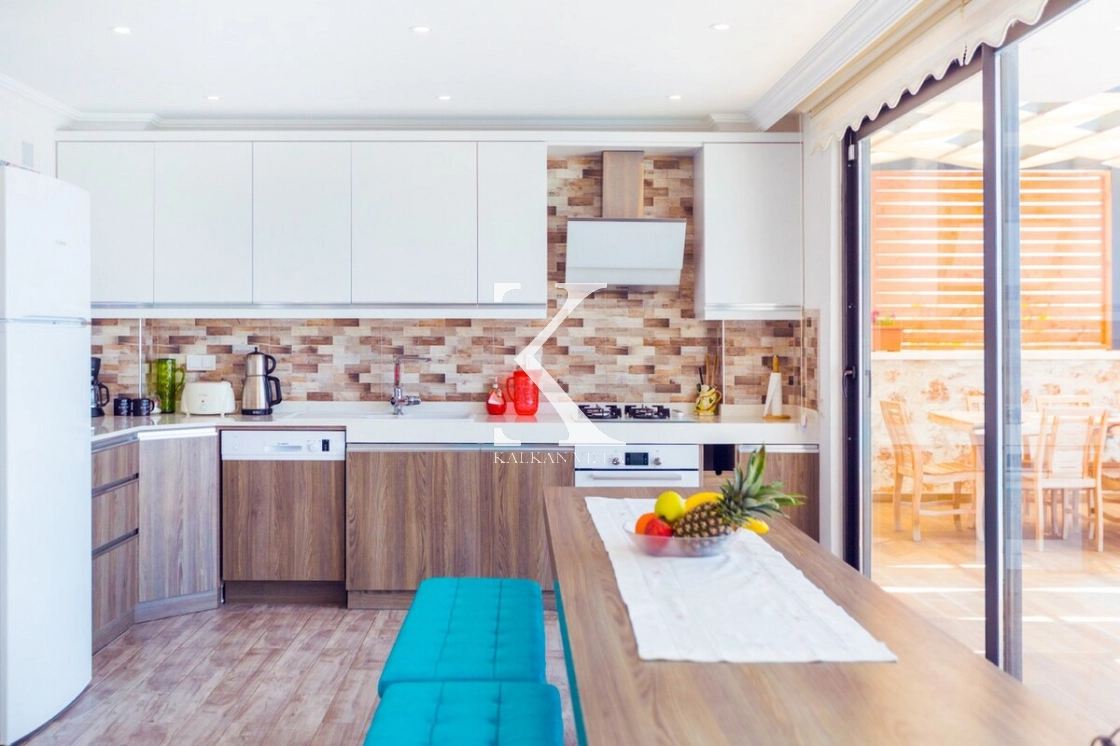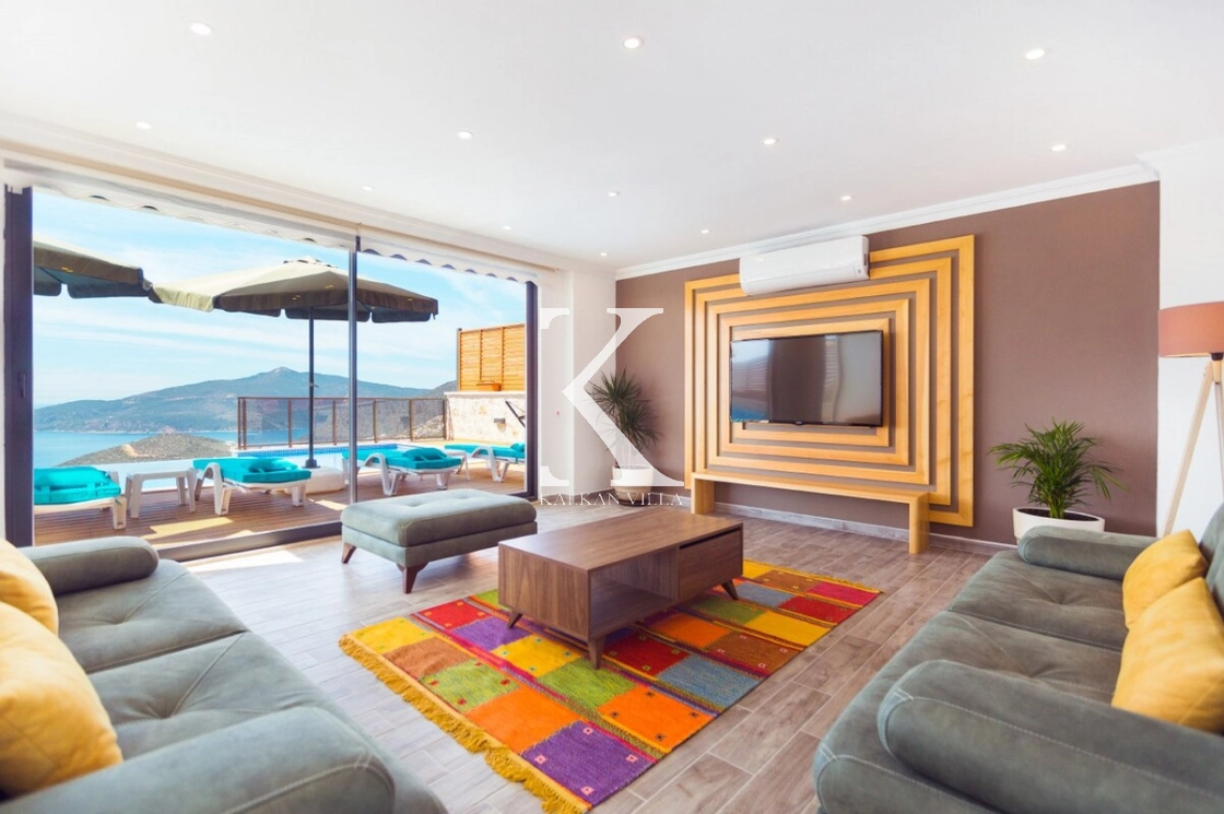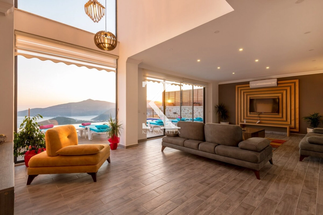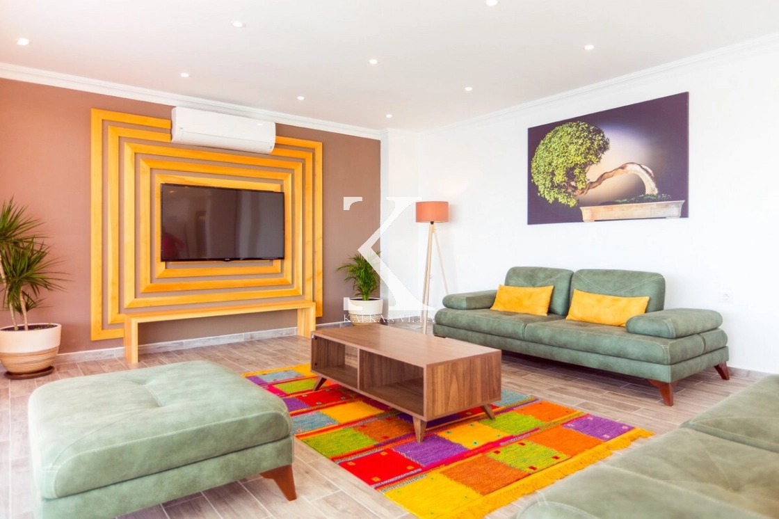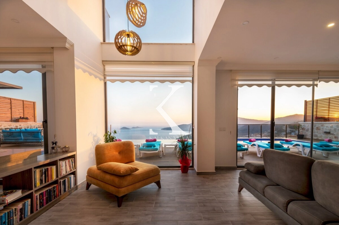 The spacious and bright living room, seamlessly connected to the kitchen, provides a cozy and stylish space to unwind and enjoy panoramic views of Kalkan’s harbor.