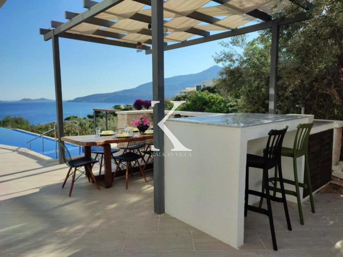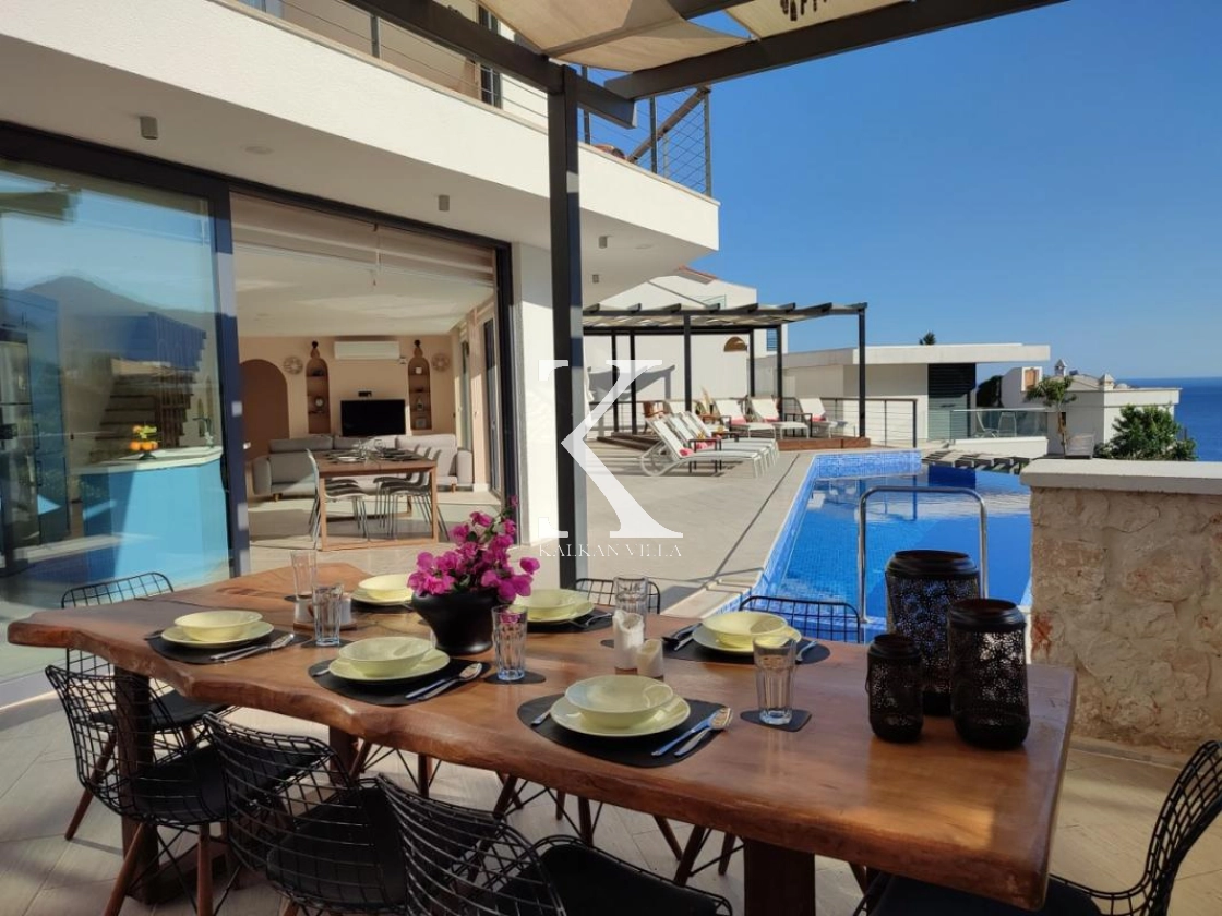Set within a spacious private garden, the villa features a private swimming pool, sun loungers, parasols, a seating area, swing, barbecue, and an outdoor dining table. On the upper floor terrace, guests can relax in the jacuzzi while enjoying panoramic sea views and breathtaking sunsets.