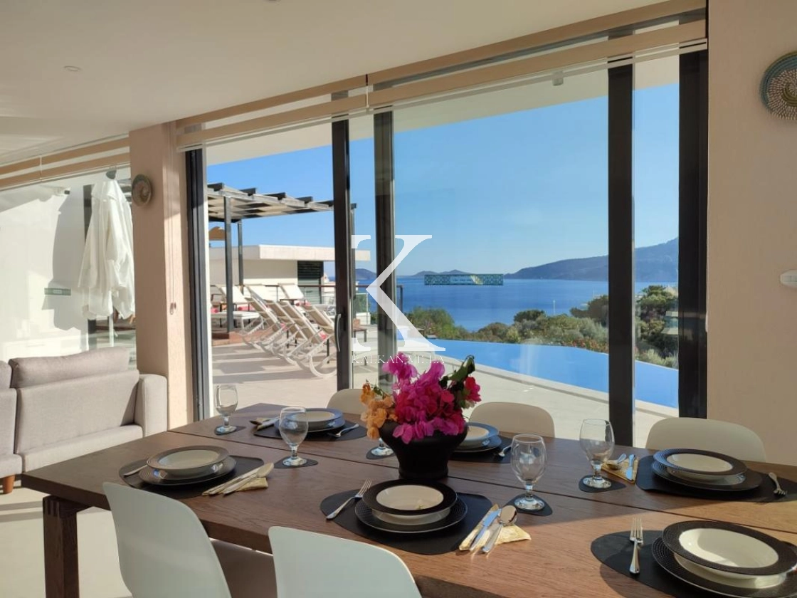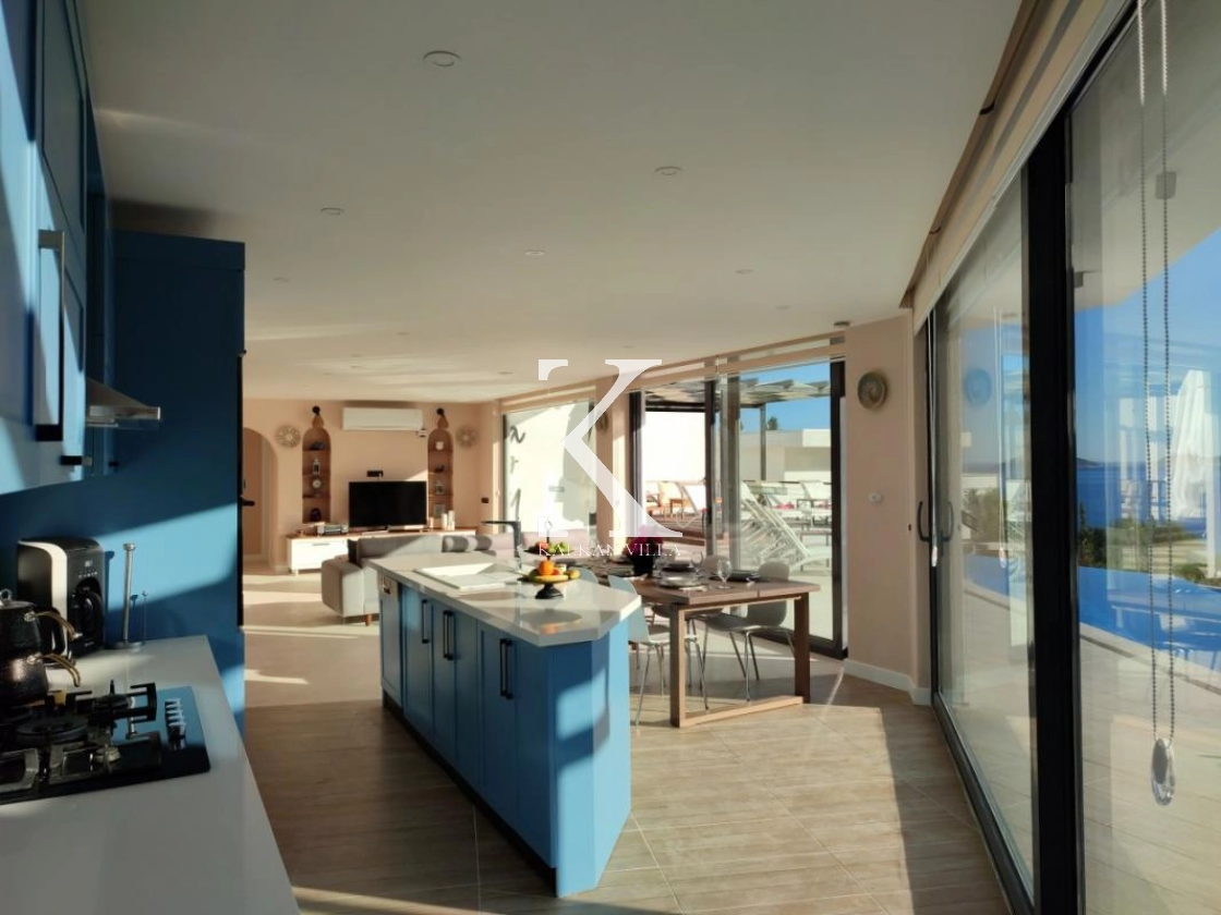 The bright and stylish living room offers uninterrupted sea and nature views and is furnished with a comfortable seating area, TV, DVD player, satellite receiver, PlayStation 3, wireless internet, and an 8-seater dining table. Direct access to the pool terrace is available from the living area.